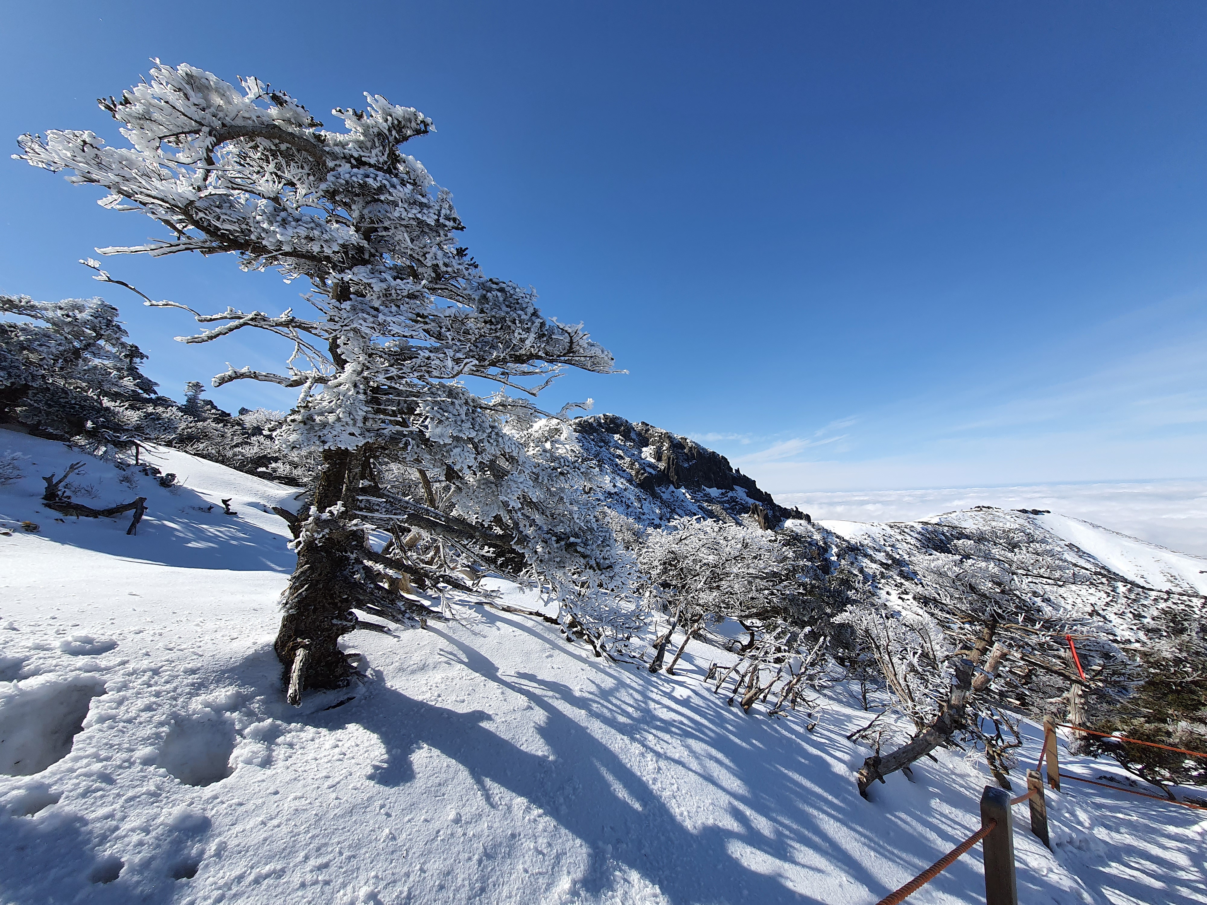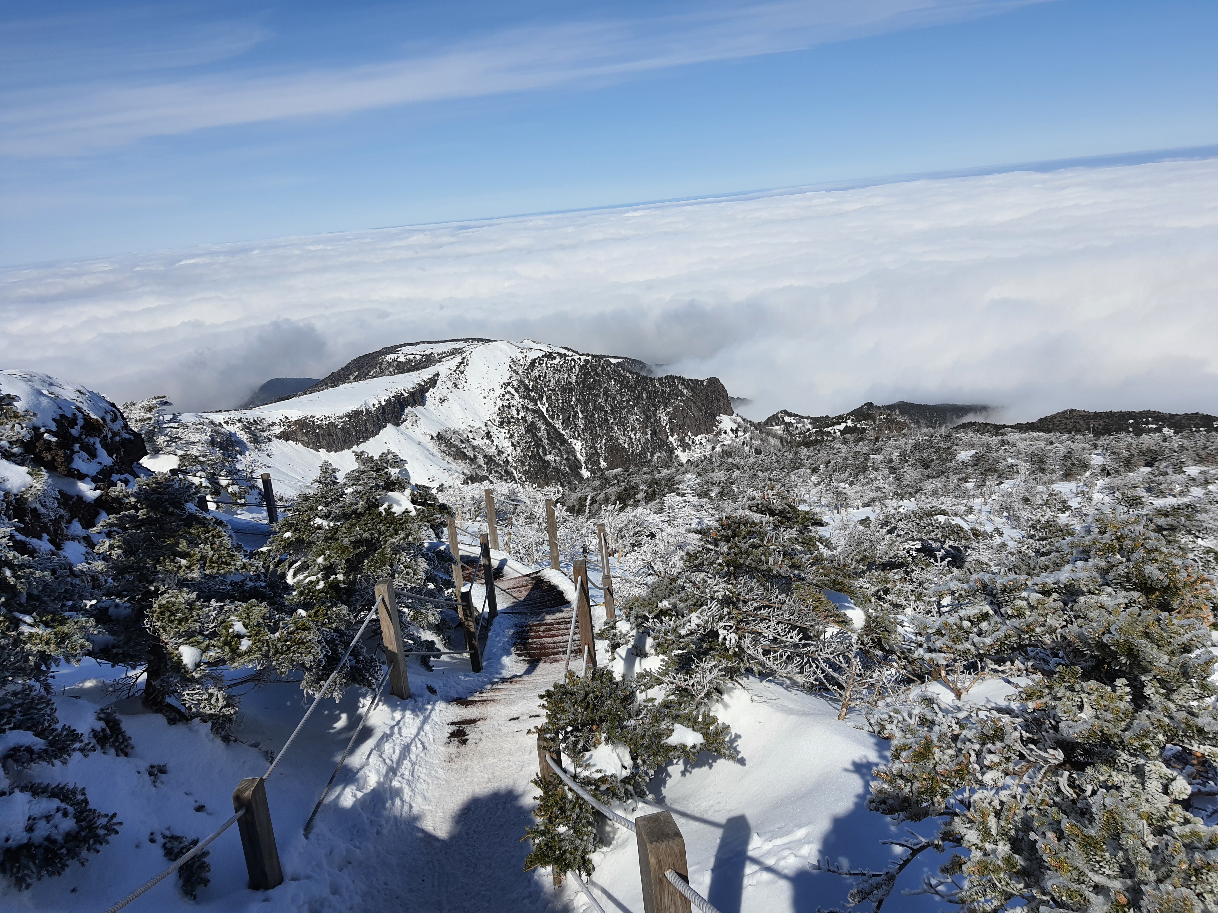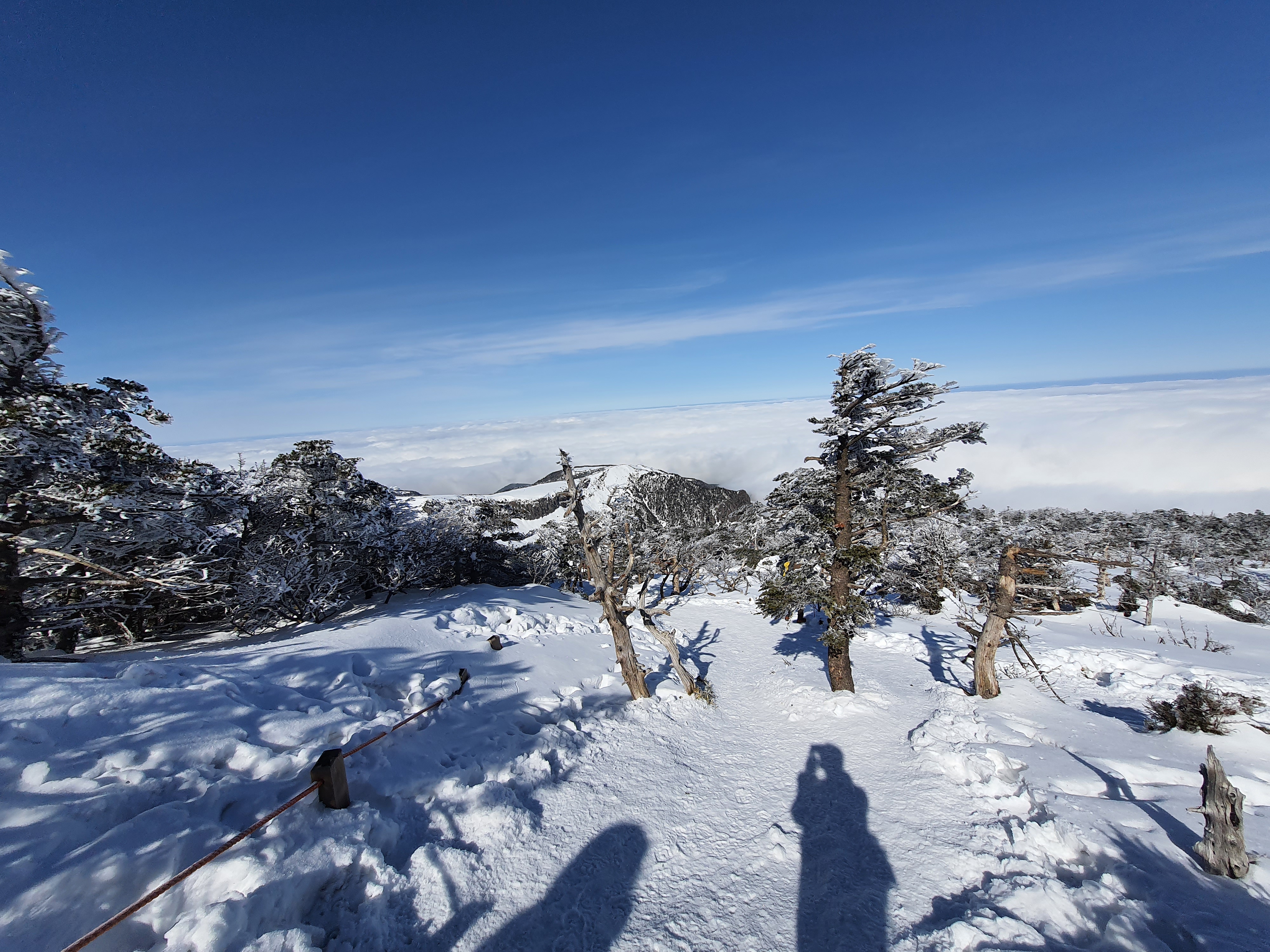 1월말의 한라산은 봄날씨 같이 느껴질 정도였다. 하지만 눈이 쌓여 있는 산행길을 아이젠을 신고 걷는다는건 평소 속도보다 훨씬 느려진다는 걸 의미하고 그만큼 힘이 더 든다. 작년 한라산 등산에서 걸렸던 시간보다 한시간정도 더 걸린 것 같다. 물론 중간에 사라오름을 올라갔다온 시간을 빼고 감안한 것이다. 작년 초여름에 사라오름을 올랐더라면 그 시간의 풍경과 눈덮인 지금의 풍경을 대비해서 볼 수 있는 기회였을거라는 아쉬움이 있다.